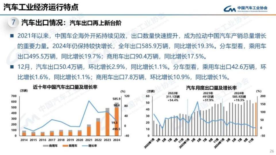 2024年汽车出口再上新台阶,全年出口585.9万辆,同比增长19.3%。分车型看,乘用车出口495.5万辆,同比增长19.7%;商用车出口90.4万辆,同比增长17.5%。